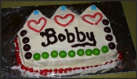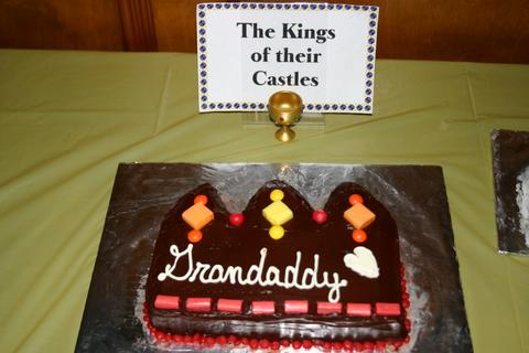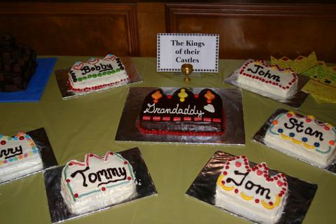 The crown cakes were made from a 9 x 13 cake as well. According to how many crowns you want to do, cut the cake into 4 pieces or just in half for 2 crowns. Separate them. Freeze them. Take each out & individually cut the crown shape on top. Some people may want to draw a pattern on cardboard if they want it to be perfect. Mine were definitely not perfect!!!! I iced mine cream colored (I didn't color the frosting) for the sons, chocolate for the big Dad (grandfather) so his would stand out. I then decorated them all with different candies: red hots, skittles, candy stars, sour sugar string things, runts, etc.
