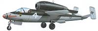 On September 8th 1944 the Reichsluftsfahrtministerium issued a requirement for a cheap and simple lightweight single seat jet fighter that was easy to build in large numbers within a very short time. It meant that the Volksjäger would have to be made from wood and other non-strategic materials, and have a simple structure capable of being manufactured by semi-skilled labour. The plane was to be easy to fly and the intention was to use Hitler Jugend pilots whose only previous flying experience was glider training and two prototypes of the He-162S tandem-seat training glider was in fact built. The aircraft was to be built in such quantities that a defective aircraft could simply be discarded and replaced with a new. Heinkel won the contract and the prototype flew on December 6th. But four days later it crashed when the starboard wing collapsed in midair. After the wings haad been restructured and given turned-down wingtips to reduce directional instability the next prototyes flew in mid-January 1945 and later that month the first pre-production aircraft was delivered to ErprobungsKommando 162 at Rechlin. In February I/Jagdgeschwader 1 "Oesau" began converting from FockeWulf-190s. But lack of fuel and attacks by USAAF delayed the training and the three sqaudrons only became operational on May 4th by which the II/JG 1 had also begun conversion. During the last hectic weeks of the war I/JG 1 only scored one confirmed kill for the loss of 10 pilots and 13 aircraft. Only 3 was lost in combat as most losses were from engine flame-outs, structural failures or dead-stick landings after running out of fuel. Despite this poor record, the difficulties was mostly due to the fact that it was rushed into production, not that it was a bad design. One experienced Luftwaffe pilot called it a "first class combat aircraft" and a British test pilot also praised it. By the end of hostilities 116 He 162s had been delivered with a further 200 awaiting flight testing and more than 800 were in various stages of assembly when the underground production centers were captured. As most other jets of that time the engine was placed well outside the fuselage. This simplyfied using more powerful engines or even using ramjets that could run on low grade fuel. But putting the engine in a nacelle on top off the fuselage gave the pilot a very bad "six-a-clock" view. It also dictated the use of double tailfins to make them stay clear of the exhaust. Baling out was clearly hazardous and the aircraft was fitted with an ejection seat. Weighing less than half of the Me262. I had to make to two compromises in the design: the tail is horizontal