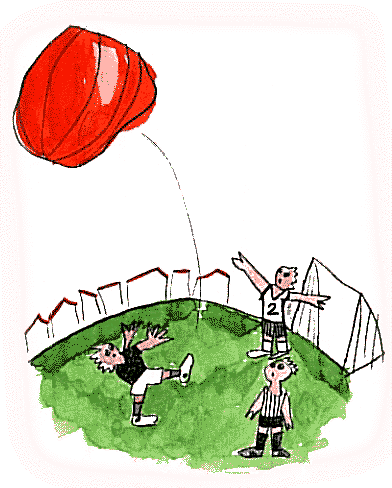 überhaupt nicht, ständig bekam er Fußtritte ab. Auch die Kinder waren nicht glücklich mit diesem Ball, der immer das Gegenteil von dem machte, was er machen sollte.Nach einer Weile holte der Stürmer der Manschaft zu einem besonders kräftigen Stoß aus und der Ball flog über die Wiese hinweg, rollte und eiern einen Abhang hinunter und endete schließlich ein einem kleinen Bach. |