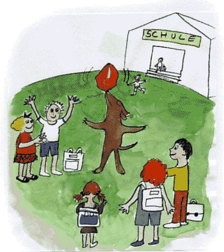 Kapriolen auf Grund seiner merkwürdigen Form. Die ersten Kinder, die in diesen Moment die Schule verließen, stellten sich dazu und schauten mit großem Vergnügen den Beiden zu. Und als nach einigen Sprüngen und Kapriolen die Beiden trocken und müde innehielten klatschten die Kinder vor Begeisterung in beide Hände. Beim Weggehen ließen sie etwas von ihren übrigebliebenen Pausenbroten für den Hund und streichelten den komischen aber so lieben Ball.Von diesem Tag an lebten die Beiden zusammen und besuchten jeden Tag eine andere Schule, um ihr aufsehenerregendes Spektakel aufzuführen. |