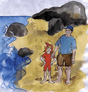 | One day Georgie and her daddy went for a walk along the beach. The golden sands streched out ahead of them. | |