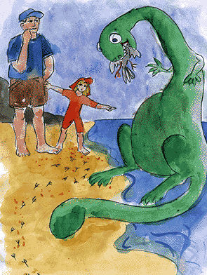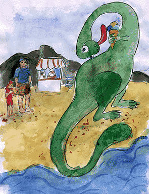 beach? asked Georgie. Daddy said I donīt know Georgie, but perhaps it was a dinosaur. What did the dinosaur do on the beach? Georgie said Perhaps they came here to get an ice cream from that kiosk over there. Dinosaurs didnīt eat ice creams Georgie said. |