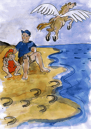 horses hoof prints which sudddenly disappeared. Where did the horses go Daddy-they canīt have flown away like the seagulls did because horses donīt have wings, do they? Maybe they galloped into the sea said Daddy Of course said Georgie they must have been sea horses. Daddy laughed. |