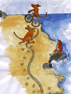 bicycle tyre track with paw prints alongside. Is this where dingoes chased a man on a bicycle? asked Georgie? How do you know it wasnīt dingoes chasing a dingo on a bicycle? Daddy asked Dingoes donīt ride bicycles said Georgie. |