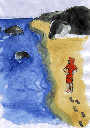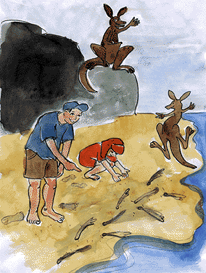 a wobbly wallaby. When they reached the rocks they turned around and all the foot prints had gone, even their own. The tide had come in. Georgie realized why she hadnīt seen any dinosaur foot prints. Theyīd all been washed away a long time ago. Georgie and her Daddy climbed the rocks and walked back home. |