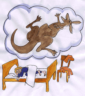 seen and imagined. That night as Georgie slept, she dreamt about fish with feet, dinosaurs eating ice creams, dingoes on bicycles, horses galloping out to sea and disappearing seagulls. But her favorite image probably was that of wobbly wallaby. |
