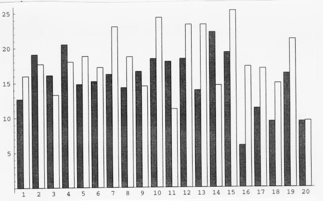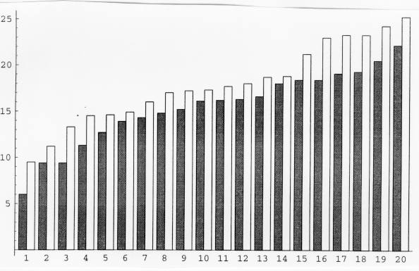 This is a bar chart of the data once it is sorted. Above number one, on the left, is the lowest result that the right-handed bowline had and on the right is the lowest the left-handed bowline had. the same goes for number twenty, except the highest results of each are put above it. In simpler words, the lowest is matched with the lowest, the highest is matched with the highest, and so on. It wil be noticed that when the data is sorted in this way, the left-handed bowline is always higher, which can be interpreted as meaning that the left-handed bowline is always higher, which can be interpreted as meaning that the left-handed bowlineholds more weight in general.