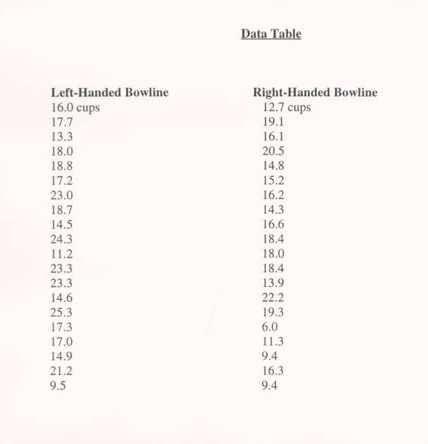 This table simply reports the data I got in my experiment. Under the column "Left-Handed Bowline" are the numbers that the left-handed bowline held before the knot broke. The same goes for the "Right-Handed Bowline." There were twenty trials for each so there are forty different numbers.