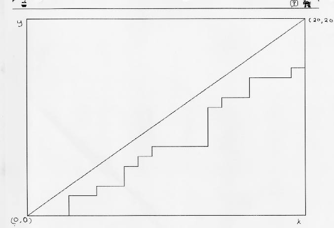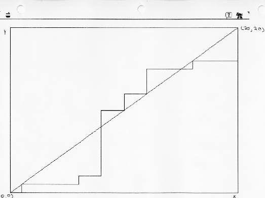 This is a computer program I wrote to plot our data on a graph. Basically, it takes all the numbers that we got for either bowline and puts them in order from lowest to highest. It then gives them out. If a number is given to the right-handed bowline, a point is drawn one over on the x-axis. If a number is given to the left-handed bowline, a point is drawn one up on the y-axis. In this way, the path makes its way to 20,20, because in the end both bowlines will have twenty results. I put the data in the program using 0s and 1s, a 0 denoting a result belonging to the right-handed bowline and a 1 denoting a result belonging to the left-handed bowline.