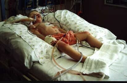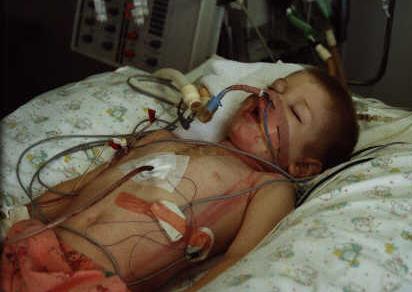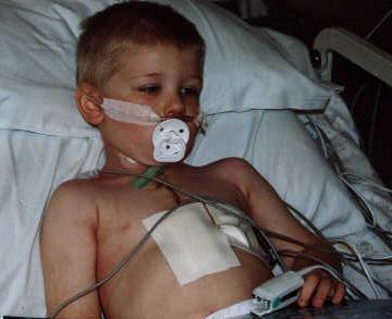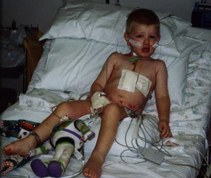 These Pictures show Jordan when he was still under anesthetic. He was hooked up to a ventilator (tube in his nose) as he couldnt breathe on his own at that stage. A very small tube down his throat to his stomach, draining out fluid. A large tube in his chest, that sat just around his heart...there's a little pocket surrounding the heart, the tube sat in there...to drain any blood or fluid away. He was hooked up to all the monitors, taking his pulse, recording his heart beat, checking the oxygen in his bloodstream, things like that. He had a drip in his neck, where the anesthetic was put into, a line in his right wrist, to take blood samples from and one in his hand, to put medications in. You can see a little box thing taped to him, with little wires coming out...those wires are run into his chest, and imbedded in his heart...it's a pacemaker, incase his heart had problems, they could give it a "jump start" so to speak. He was also hooked up to a Cathedar.