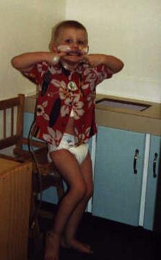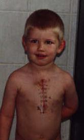 On Feburary 27th,2001, Jordan went into theatre to have a vsd closure, which is in normal talk, having a hole in his heart patched up. The discovery was made at birth that he had what they call a heart murmur, and we have been to and from doctors and specialists since that time. The problem was not life threatening to Jordan at the beginning...but it would have been, soon, as he developed some muscle growth and scar tissue, that surrounded his Aorta. From one visit to the Heart Specialist....to the next, this muscle growth had increased in size...it had basically DOUBLED. So that was the main reason for his surgery...to remove this muscle growth, as it was restricting the blood flow to his lungs, and had it been left longer, major problems would have been likely to occur. The Hole in Jordans heart, caused very minimal problems...if any for him....we were lucky in that aspect. The Doctors decided to go ahead with the surgery when he turned 3, as that age is a good age to operate, as the child recovers quicker, and they are bigger also, then a younger child...