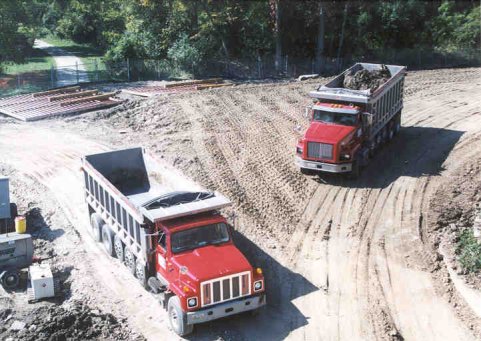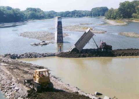 Trucks delivering cofferdam fill |