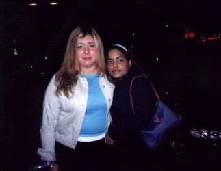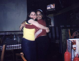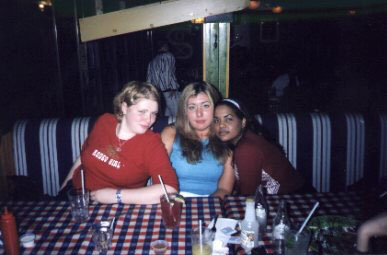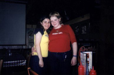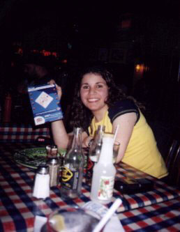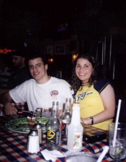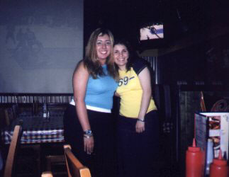 Limor with our waiter at Shoeless Joes..hey, where did that condom go?