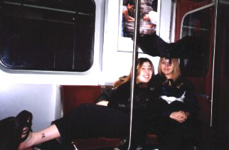 Me and Lisa on the subway ride home. If you look closely, the umbrella is hanging upside down, and a pager is hanging from the umbrella (I know, we're really stupid!)