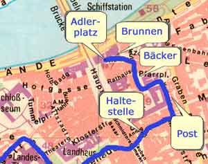| Zwar ist sein Schulweg hier noch nicht zu Ende, aber als Beispiel reichen diese zwölf ersten Stationen aus. Wichtig ist, dass diese Reisestationen ganz fest im Gehirn als Anker abgespeichert sind, mit denen man die Bestandteile der zu lernenden Liste verknüpfen kann. Man nimmt also am besten Wege, die man "im Schlaf" gehen könnte. |