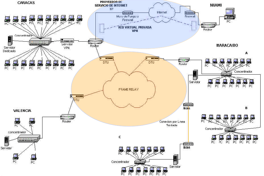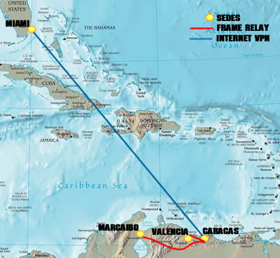 por estar ubicada a Entre las sucursales de Caracas, Valencia y Maracaibo, la comunicación se realiza utilizando tecnologú} Frame Relay, la cual divide la información en cuadros de datos que transmite mediante tecnologú} de conmutación de paquetes. El método es flexible ya que los cuadros pueden ser de cualquier tamaño dentro de cierto rango, incluir cualquier información para el control de protocolos y transmitir cualquier protocolo de red. Entre Caracas y Miami se implementa una Red Virtual Privada (VPN), la cual se extiende mediante un proceso de encapsulación y encriptación de los paquetes de datos al punto remoto (Miami), mediante el uso de una infraestructura pública de transporte. Los paquetes de datos de la red privada viajan por medio de un "túnel" (tecnologú} de Túnel) definido en la red pública. AsEmismo, están protegidas por los muros de fuego. Cabe destacar que en las redes LAN de las sucursales