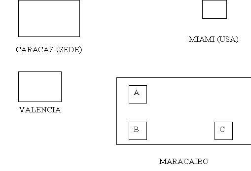 La sede central (Caracas) consta de 20 usuarios, un Servidor Dedicado que se encarga de manejar los datos de todos los usuarios y pasarlos al Servidor VPN y un Servidor VPN, el cual se emplea para que el sistema sea más eficiente, conectados a través de una Red de Área Local, implementada sobre una topologú} fúica en Estrella, utilizando cable UTP nivel 5, un Concentrador de 24 puertos de 10/100 Mbps, con detección automática de velocidad, un DTU que permite la conexión Frame Relay y un Router de alta velocidad con acceso a Internet y soporte para múltiples protocolos (IPX, TCP/IP). La sucursal Valencia consta de 5 usuarios conectados a través de una Red de Área Local, implementada sobre una topologú} fúica en Estrella, utilizando un Concentrador de 8 puertos de 10/100 Mbps, con detección automática de velocidad, un Router de alta velocidad y de acceso remoto y un DTU para implementar una conexión Frame Relay. El cableado empleado es UTP nivel 5. La sucursal
