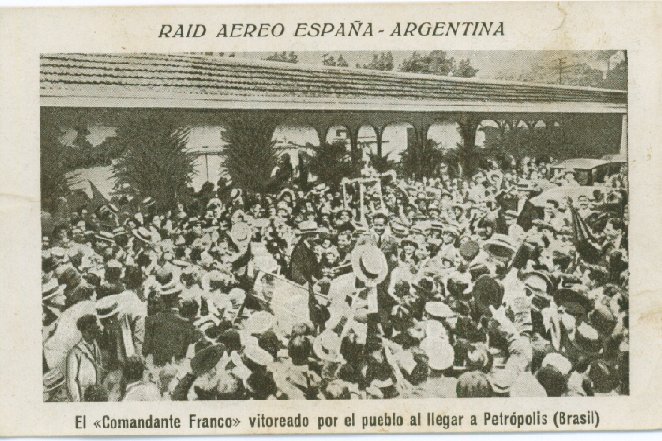 recorrido. El día 31 se salvan, no sin peligro, los 540 Km que separan la isla de Pernambuco de tierra firme. Cuando faltan mas de cien kilometros la hélice posterior se rompe y es preciso arreglarla en pleno vuelo. Ello alarga en mas de una hora el tiempo previsto para la travesia. En Pernambuco la tripulación descansa para realizar reparaciones. El 4 de febrero se llega hasta Rio de Janeiro (2.100 Km) en doce horas y quince minutos. El recibimiento tributado a los aviadores fue apoteósico. El día 9 Montevideo, al día siguiente, Franco, Ruiz de Alda, Duran y Rada llegan a Buenos Aires entre aclamaciones de muchedumbres de argentinos y españoles, que lloran, gritan y vitorean a España. La llegada de los españoles se recordará durante mucho tiempo. Los grandes díarios bonaerenses exaltaron la hazaña de Franco y sus compañeros como algo que enorgullecia a toda la estirpe Iberoamericana. En total el Plus Ultra recorrió 10.270 Km. empleando 59 horas y 39 minutos. |