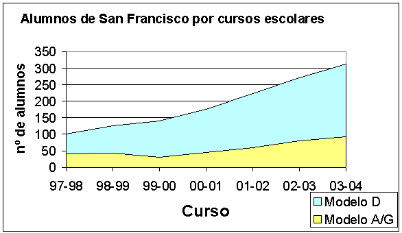 Conviene recordar que este proceso de traslado se decidió poner en marcha en el curso 1999-2000. Ese curso los alumnos matriculados en modelo A/G eran 31 y los de modelo D 109 mientras que actualmente son, respectivamente, 93 y 219, es decir, que en un caso se han triplicado y en otro duplicado. El San Francisco de entonces cabía, pero el actual no cabe. Y San Francisco todavía debe crecer más, tanto en número de grupos (hasta completar la segunda línea de modelo D) como en ocupación de los mismos, sobre todo atendiendo al repunte de la matrícula en castellano.