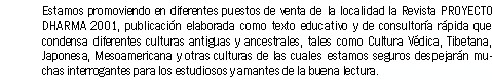 Sea de bienvenida nuestra primera manifestación a quienes apoyan este proyecto, nacido del esfuerzo conjunto de profesionales jóvenes que se suman a la vasta experiencia de quienes nos preceden en el sendero de la maravillosa Ley Universal. El mismo tiene como objetivo dar a conocer a nuestro planeta, nuestras ancestrales culturas nacidas de Pensadores Inigualables que desde el más remoto pasado, en un acto de Fe inconmensurable, plasmaron con su pluma en el libro de nuestras conciencias colectivas, sublimes enseñanzas Místicas, Filosóficas y múltiples expresiones de arte Universal.
