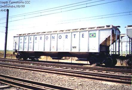 Vista dos novos vagões de alumínio da FERRONORTE. Fotos pertencentes ao acervo de Alberto H. del Bianco. Já foram adquiridos 780 vagões tipo hopper de alumímio, para o transporte de grãos. A escolha do alumínio é resultado de cuidadosa avaliação técnica e econômico-financeira desenvolvida pela empresa, visto a menor tara e a elevada capacidade volumétrica permitirem um transporte adicional significativo de carga, quando comparado com o vagão equivalente de aço. Essa vantagem, somada à maior facilidade de limpeza e manutenção, resulta num menor custo operacional e de manutenção.