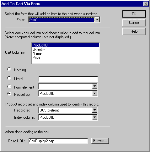 Se você deseja configurar sua página para que o consumidor selecione itens através de um elemento de formulário (como menus pop-up), os quais serão adicionados ao carrinho de compras, configure os elementos do formulário, em sua página, dando a eles os nomes apropriados, posteriormente você poderá usar o comando Bind (ligar) para ligá-los às colunas do carrinho de compras.