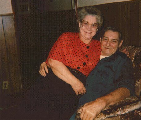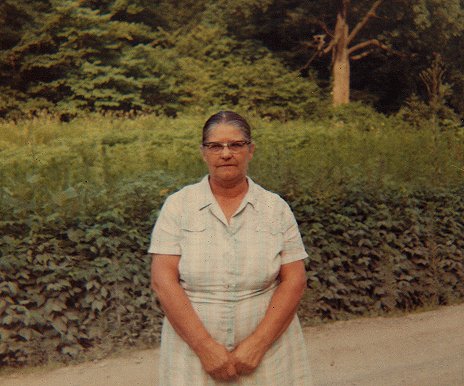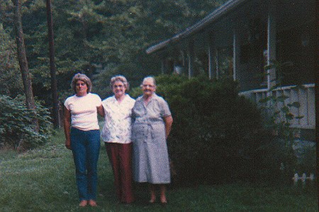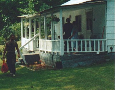 (Doug carrying a bag, Steve with Grandma Emma on porch)