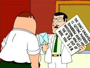 ![]() ![]() Hello? Hhey, Big Fat Paulie! No, Lois isn't dead yet. What do you mean you're gonna fire that hit man. What do you mean you thought she'd be 6 feet under right now and we'd be able to catch a movie. What do you...!!!! |