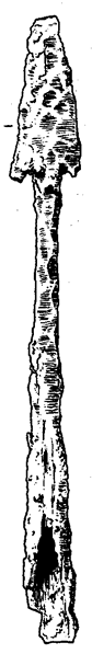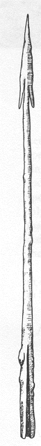 | More Angons At left: two angons that were deposited in peat-bogs within the Anglian homelands c 400 AD, just before the migration to Britain. At right: two angons buried in Britain during the English conquest. "Agathias, writing of the wars between Justinian and the Teutonic invaders of Italy, records that the chief weapon of the invaders was a light, barbed weapon which could be used as a javelin or in hand-to-hand fighting...It may be the angon, which was found mainly on the Continent, but which does occur in this country and especially in Kent...". From The Anglo-Saxons, by D. M. Wilson. Other angons have been found in Surrey and the angon shown below was found in Sussex. |
