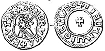 The coin shown above is one of the many produced by the Farthegn family of moneyers. It was struck some time between 1029 and 1036 at the mint in York during the reign of King Cnut. The reverse side of this penny (shown on the right), has the words "+FAERDEIN ON EOFE", or, Farthegn at York, placed around the outer edge with a short cross located at the center of the coin. This cross facilitated the cutting up of the coin into four pie-shaped pieces, then called feorthungs, later called ferthings, and today called farthings.