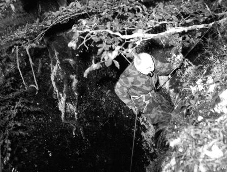 The entrance of Consolini Abyss: a spelaeologist is going down in the first pit of 91 meters with the double rope technique using only a single rope. His seat harness is made with a thin rope wrapped around his thighs like an "8". There is one snaplink (carabiner) for the quickdraw of the rope that frictions on the spelaeologist's shoulder.