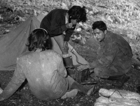 The telephone set at the entrance of the Consolini Abyss. It was used to stay in touch with the internal leading team. From left to right: Maria Antonietta "Nietta" Sinibaldi (turned back), Alberta Felici (at the telephone), Beniamino "Nino" Toro.