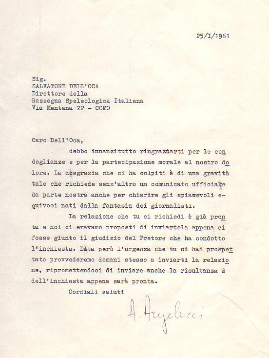 Riproduzione della lettera con cui Angelucci rispose a Salvatore Dell'oca, che anticipa la relazione di Gianni Negretti.