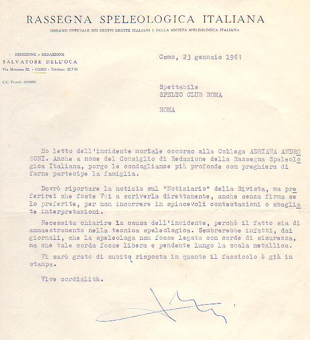 Lettera di Dell'Oca allo Speleo Club Roma