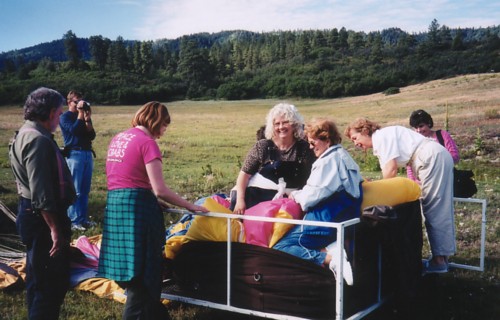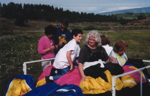 My mom helpin' to deflate our balloon after the ride. It was fun and very high up. Unfortunately, we landed in a big, muddy field. I helped tow the sucker in, and I had mud up to my knees. It was fun, though.