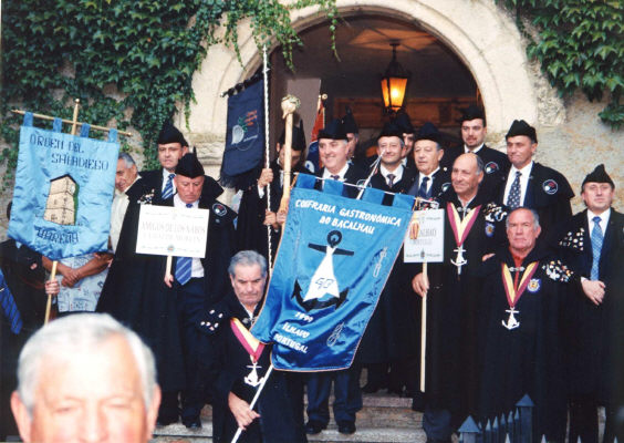 Cofrades de la Nueva Orden del Pimiento, acompañados por Cofrades de otras órdenes gastrómicas venidos de otros lugares, posan a la salida de Misa.