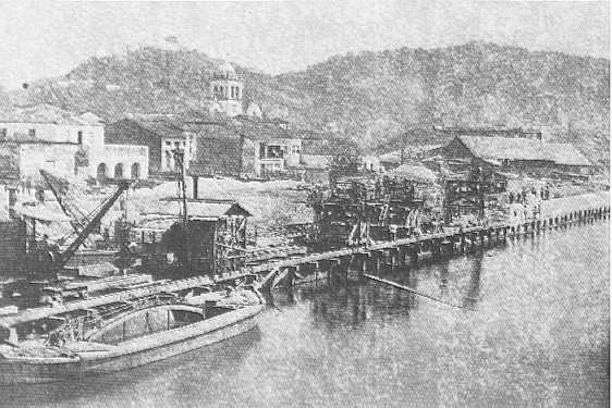 | Foto do cais de Santos, mostrando o assentamento dos trilhos para a passagem de guindastes e composições ferroviárias. Foto do acervo da Biblioteca do Museu Paulista, publicada em ASPECTOS DA HISTÓRIA DA ENGENHARIA CIVIL EM SÃO PAULO, 1989 | |||||||