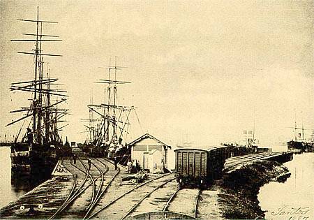 | Foto do início das operações no Cais de Santos, onde vê-se já os vagões de mercadorias chegando até os navios, mas ainda não se observam os guindastes, sendo o embarque das mercadorias feito de forma manual. Foto obtida na Internet. | |||||||