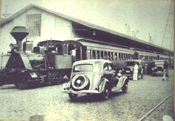 | Foto do cais de Santos, mostrando uma locomotiva KRAUSS, na bitola de 1,60 metros, puxando um trem com imigrantes japoneses. Essa composição seria levada até a estação da S.P.R., onde seria engatada a uma locomotiva dessa companhia e tracionada até São Paulo, mais precisamente para a Hospedaria dos Imigrantes. Foto do autor. | |||||||
