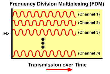 En transmisión analógica, el transporte de señales agrupadas en canales capaces de transferir cada uno de ellos desde unas decenas hasta varios miles de comunicaciones, a fin de optimizar los medios de transmisión, se realiza mediante lo que se conoce como Multiplexación por División de Frecuencia (Frecuency DivisionMultiplexing FDM), el cual es un método para asignar una banda única de frecuencias a cada canal de comunicación dentro de un espectro de frecuencias comparativamente ancho del medio de transmisión (ver Fig. 9).