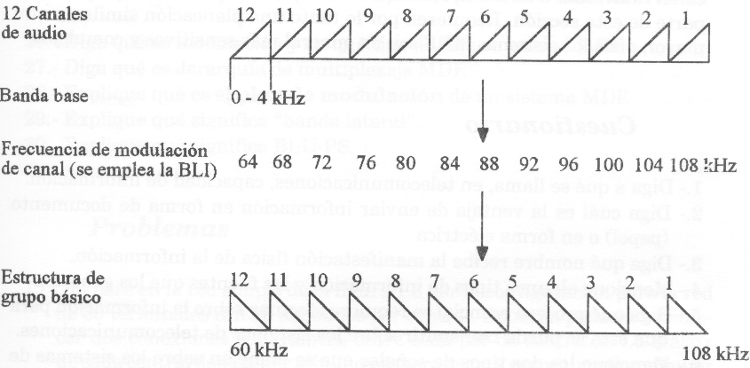 En FDM, un Grupo estándar como lo define el CCITT ocupa la banda de frecuencias de 60 a 108 kHz y contiene 12 canales de voz. Cada canal de voz es el nominal de 4 kHz y ocupa el espectro de 300 a 3400 Hz; el restante 0,6 kHz es una separación que evita la interferencia de voz entre canales adyacentes. El Grupo se forma por la mezcla de cada uno de los 12 canales de voz con la frecuencia portadora particular que se asocia al canal. Por convención, en la banda de 60 a 108 kHz el canal de voz 1 ocupa el segmento de frecuencias más alto, entre los 104 a 108 kHz (ver Figura 10).