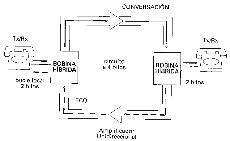 En términos telefónicos (frecuencia vocal) la híbrida es un transformador, y se puede considerar como un divisor de potencia con cuatro conectores, cada uno para un par de hilos. La misión de la bobina híbrida es adaptar el circuito a dos hilos del bucle de abonado a los cuatro hilos que conforman un circuito interurbano (un par para transmisión y otro para recepción). Si esta adaptación fuese perfecta, no habría retorno de señal en ninguno de los dos sentidos, pero como esto normalmente no ocurre así, ya que la impedancia de cada bucle de abonado es diferente por serlo su longitud, se producen desacoplamientos que hacen que parte de la señal transmitida, en el extremo receptor, se induzca en el circuito contrario resultando en una señal que se mezcla con la generada en dicho extremo y que es captada como un eco, que si es muy grande puede molestar considerablemente.