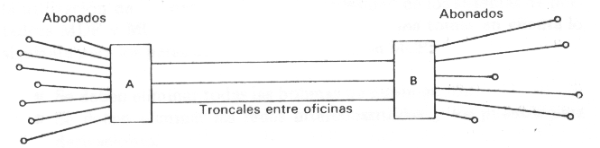 Fig 3. Diagrama simplificado de una planta telefónica. A y B representan centros de conmutación (oficinas centrales).