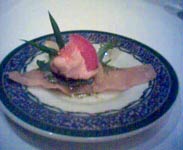 ikan (?) yg dipotong tipis2 dan saos tomat. Dimakan dengan