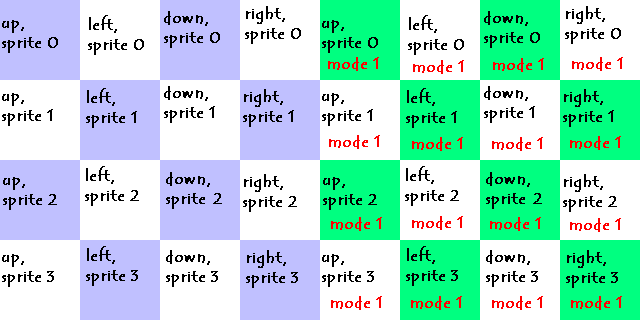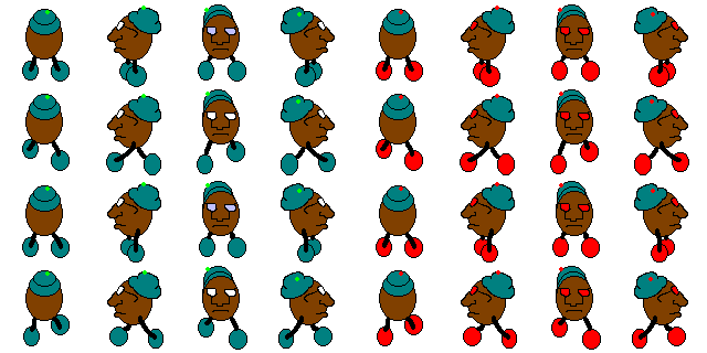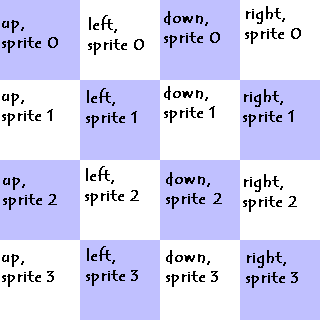 | CREATING A MULTI-IMAGE NPC * Description: Many NPC's are scripted which create animated, custom baddies or new "forms" for the player to appear in. An example of such a "form" is the Marro NPC that is posted for download on the Graal Downloads page. On non-p2p servers, these NPC's cannot be animated through use of Gani files. This leaves scripters with basically 3 options: #1 Create animated .gifs or .mngs to show the animation. #2 Create a single, self-contained image for each frame or sprite of the NPC. #3 Create a multi-image gif or png with each sprite (and direction) represented as a tile in the image. To be brief, choice #1 has many limits on what you can do with it, and it also tends to lag in online play. Choice #2 requires the player to download a new image every time the NPC does something new, causing the NPC to disappear unexpectedly while the image loads. Choice #3 has more versatility than #1 and, unlike #2, uses only a single image. This is the option I explain below. * Process: First, you need to decide how big (in pixels) you want the NPC to be. Start drawing in your graphics program to get a feel for how to design the graphics within those size limits. -- I would recommend that the image pixel size be a multiple of 16. This makes the image much easier to place within the game. If you must, you may leave a little extra space around the image to make this work. Second, decide how many frames or sprites you want for each animation. For example, a baddie might have one sprite (per direction) for standing still, 4 for walking, etc. (I find that for simple scripting - and smaller image size - 4 sprites for walking is good enough to make a reasonable smooth animation. Also, you might leave out the standing-still images and simply use a walking sprite instead.) Remember to include a sprite set for each action you want the NPC to perform - including dying. Third, create a blank image file with the following proportions: WIDTH: 4 times the width of each frame HEIGHT: Total number of sprites times the height of each frame **IMPORTANT** EACH frame must be the same size in order for my instructions to work properly! That means make EACH ONE the size of the LARGEST image!!! Note: someone pointed out that making all the images the same size isn't necessary. But it makes it a WHOLE lot easier to script, and the system I use here requires it. Fill the image with a checkerboard-like pattern, each block the size of one frame, to make the individual frames easy to draw correctly. For an example, click here. In my example, I have each block on the "checkerboard" labeled to show where each frame should be placed. NOTE: If you want the NPC to have more than one "mode" which will use the same sprites, but different (or altered) images, double the width of the image and continue the checkerboard pattern. For an example, click here. Fourth, draw the actual frames. Try to make the images in each column line up. If you don't, the NPC will appear to jump or wobble left and right as it moves. Also try to keep the spacing more or less constant between the top of the image and the top of its frame, else the NPC will seem to "bounce." Of course, deliberately controlling this bounce may make walking, etc, seem more natural-looking. The last step in creating the image is to remove the checkerboard pattern and surround the images with a color which can be set "transparent" by your gif or png editor. Check your editor help files if you don't know how to do this. For an absurd example of a finished image (which will never make it on Graal) click here. The reason I had you set the image up in this way is to make scripting simpler. The next page explains how to script this NPC. |