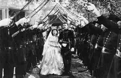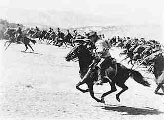 Der Plot ist der längste auf dieser "Reise durch die Vergangenheit"; aber Dikigoros kann ihn seinen Lesern nicht ersparen - er ist so perfekt, daß man praktisch nichts auslassen kann, ohne den Gesamteindruck zu zerstören. Außerdem will er denjenigen seiner Leser, die nur die - von zweieinhalb auf anderthalb Stunden gekürzte - deutsche Version des Films kennen, den vollständigen Inhalt nicht vorenthalten. Man nehme: Ein historisches Ereignis, das allen noch gut (aber nicht zu gut!) in Erinnerung ist, einen gut aussehenden "Helden" (der Australier Errol Flynn stand damals im Zenith seiner Karriere), eine hübsche Heldin (für Olivia de Havilland galt das gleiche), viel Dramatik, viel Action, ein persönlich tragisches Schicksal und ein Happy-end fürs Vaterland. Vorhang auf, Film ab, die Propaganda-Maschine läuft: 1857. George Armstrong Custer aus Michigan, ein schnittiger junger Kadett, kommt an die Offiziers-Akademie West Point mit dem erklärten Ziel, dereinst als Kavallerie-General Ruhm zu ernten. ("Glory" wird zur zentralen Vokabel des Films, auf die wir noch etwas ausführlicher zurück kommen werden.) Daran versuchen ihn vor allem zwei Bösewichter zu hindern: der blonde, blauäugige Mit-Kadett Ned Sharp ("Scharf") - ein typischer Deutscher -, und der kleine, dunkelhaarige Major Romulus Taipe - ein typischer Italiener mit geradezu fascistisch-pingeliger Ordnungsliebe. (Beide Figuren sind nicht historisch, sondern von den Filmemachern meisterlich erfunden.) Zum Glück hält Oberst Sheridan, der Leiter der Militär-Akademie, seine schützende Hand über Custer; und als 1861 der Sezessionskrieg ausbricht, verschafft er ihm, obwohl er der schlechteste Kadett aller Zeiten ist (das ist historisch - bis auf eine einzige Ausnahme, auf die wir später zurück kommen werden) sein Leutnants-Patent und schickt ihn nach Washington, ins Hauptquartier der Nordstaaten. Darüber verpaßt Custer ein Rendez-vous mit Libbie, der Tochter des reichen Friedensrichters Bacon aus Michigan (die er zufällig in West Point kennen gelernt hatte, als sie dort ihren Patenonkel Sheridan besuchte), und das für nichts und wieder nichts, denn Romulus, inzwischen General und für die Vergabe von Planstellen zuständig, läßt Custer im Wartestand versauern und will ihn allenfalls als Ausbilder für Infanterie-Rekruten abstellen. Doch eines Tages lernt Custer beim Mittagessen den Oberbefehlshaber der Unionstruppen, den gutmütigen alten General Winfield Scott, kennen und überredet ihn, ihn einer Kavallerie-Einheit zuzuweisen.