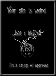 2. There must not be ANY stolen images. 3. No linking graphics to other people servers without their permission. (when using other peoples graphics, they must be downloaded off their server and uploaded onto your own server.) 4. Give credit for graphics and backgrounds you use. 5. Provide a link back to my homepage at http://www.oocities.org/fire_ey And remember, it always helps to sign my Guestbook! |