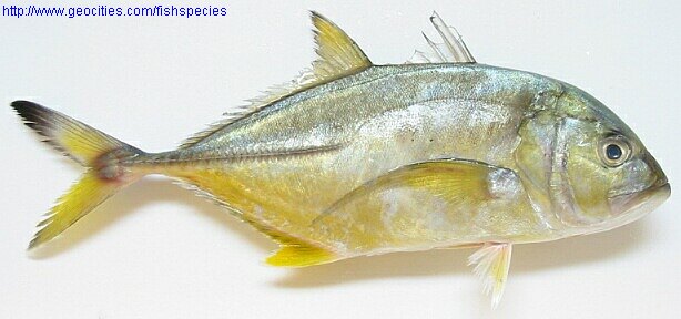 Blacktip Trevally Caranx heberi Carangidae [Jacks & pompanos] 34 cm [max to 85 cm] 9.2 cm 476 gms [max to 12.5 kg] Marine, brackish Clear coastal waters, over rocky reefs. Feeds on fishes & crustaceans. Minor commercial fisheries & Gamefish. Yes. Black tip on the upp lobe of the caudal fin. Body bronze green above, yellowish-silver below. Dorsal spines:9, rays:19-21; Anal spines:3, rays:15-17. Scutes: 30-40. |