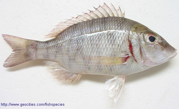 Pink Ear emperor Lentjan Lethrinus lentjan Lethrinidae [Emperors] 19.5 cm [max to 52 cm] 6.4 cm 155 gms Marine, brackish 20 - 90 m Reef-associated Highly commercial fisheries Yes, this fish was caught off Changi Dorsal spines:0, rays:0; Anal spines:0, rays:0. |