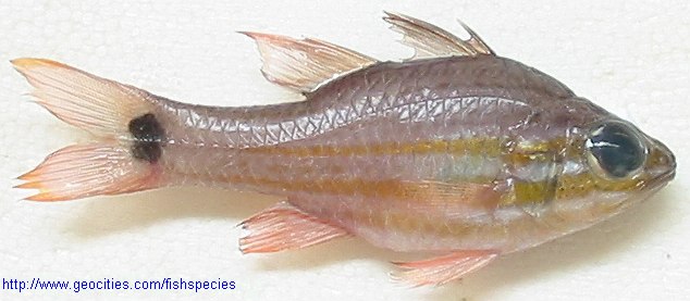Candystripe Cardinalfish Apogon endekataenia Apogonidae [Cardinalfishes] 8.8 cm[max to 13 cm] 2.6 cm 20 gm Marine Yes, this fish was caught off Bedok Jetty on 1/10/03 Reef-associated A few horizontal orange to brown stripes from head to the caudal spots. A prominent black ocellas on the base of the tail fin. Body slightly longish in shape. Dorsal spines:8, rays:9 ; Anal spines:2, rays:8 |